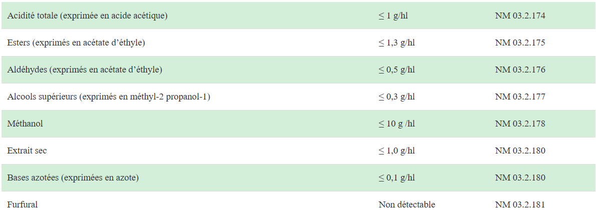 Valeurs maximales en éléments résiduels (à 100% volume d’alcool)